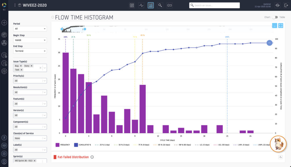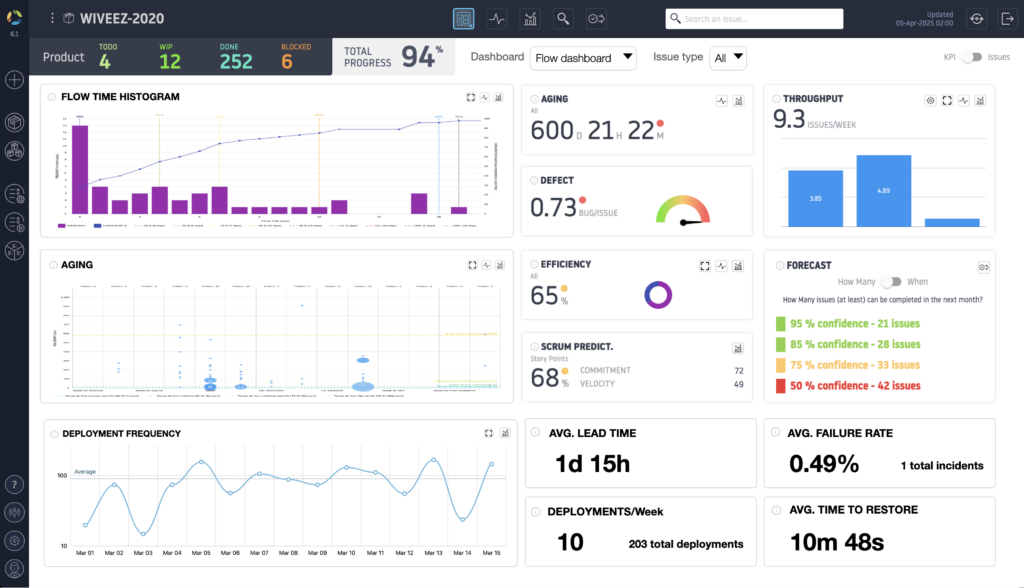 - Flow Distribution: Analyzes the distribution of different types of work (such as features, bug fixes, or technical debt tasks) within the team’s workflow, allowing you to identify priorities and adjust resources accordingly.