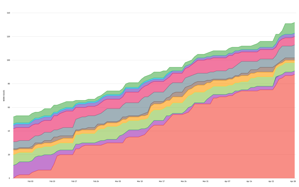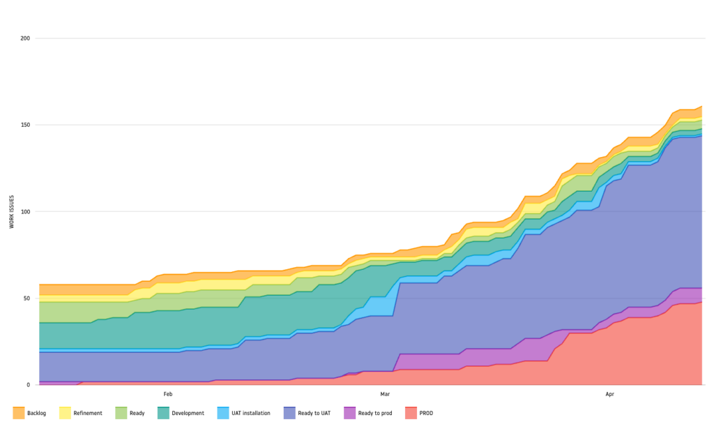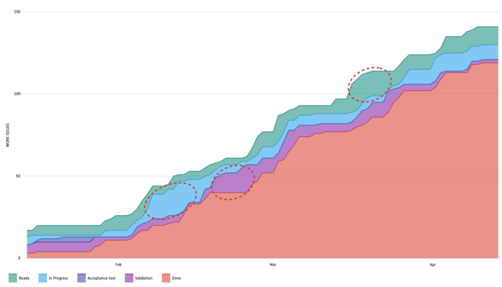 Si une étape voit sa bande gonfler, cela signifie que les tâches s’y entassent. Exemple : si la bande « Ready to UAT » s’épaissit, cela indique que les tickets mettent du temps à être testés, soit en raison d’un problème de priorisation, une mauvaise gestion des limites de WIP par rapport à la capacité à faire de l’équipe ou des blocages empêchant les tickets d’avancer.