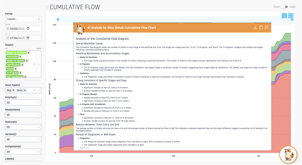 Pour accompagner les équipes dans la maîtrise de leur performance opérationnelle, nous avons développé Alice, une intelligence artificielle spécialisée dans l’analyse des Flow Metrics et l’interprétation du Cumulative Flow Diagram (CFD).