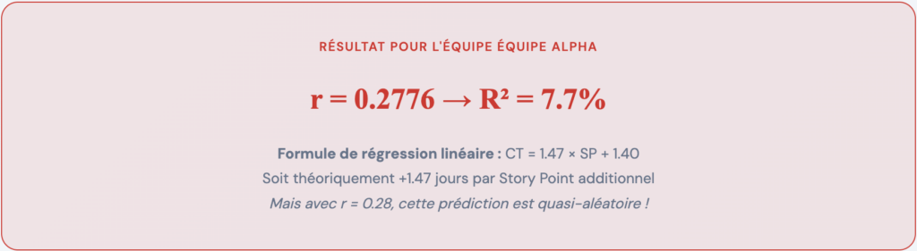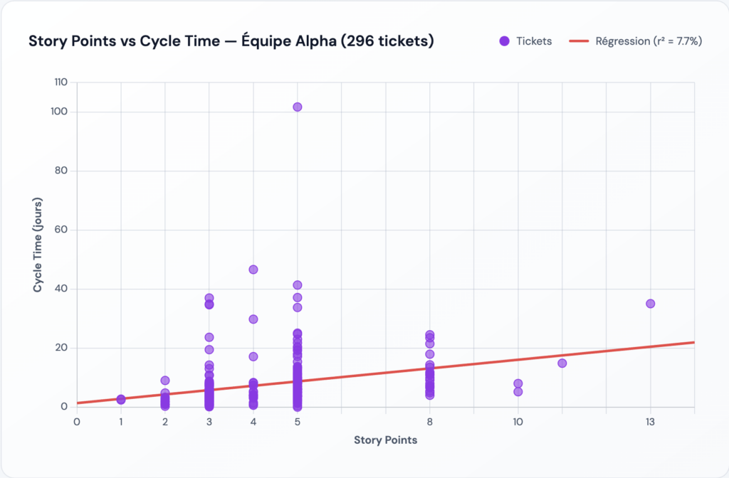 Interprétation pour l’équipe Alpha: Avec R² = 7.7%, les Story Points n’expliquent que 7.7% des variations de durée. Les 92.3% restants proviennent d’autres facteurs (complexité cachée, dépendances, interruptions, dette technique, etc.).