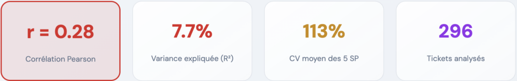 Avec des R² souvent inférieurs à 15%, les Story Points n’expliquent qu’une fraction marginale du temps réel de livraison. Le reste (dépendances, interruptions, dette technique) échappe totalement à l’estimation.
