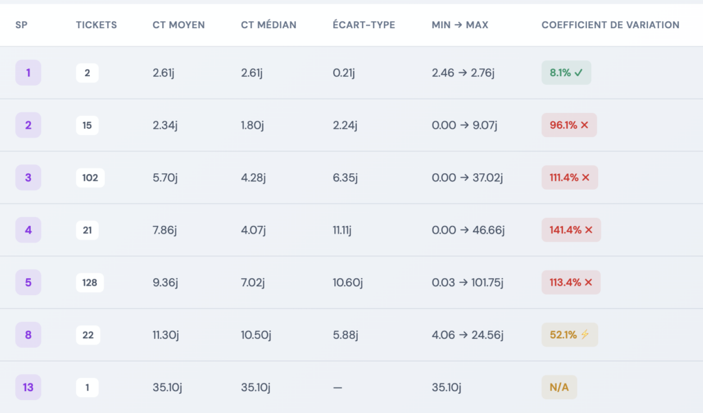 La mesure du coefficient doit s’accompagner d’une analyse plus détaillée. Dans le cas de notre équipe Alpha cette analyse révèle des coefficients de variation (CV) alarmants. Un CV supérieur à 25% est généralement considéré comme le seuil au-delà duquel la prédictibilité devient problématique.